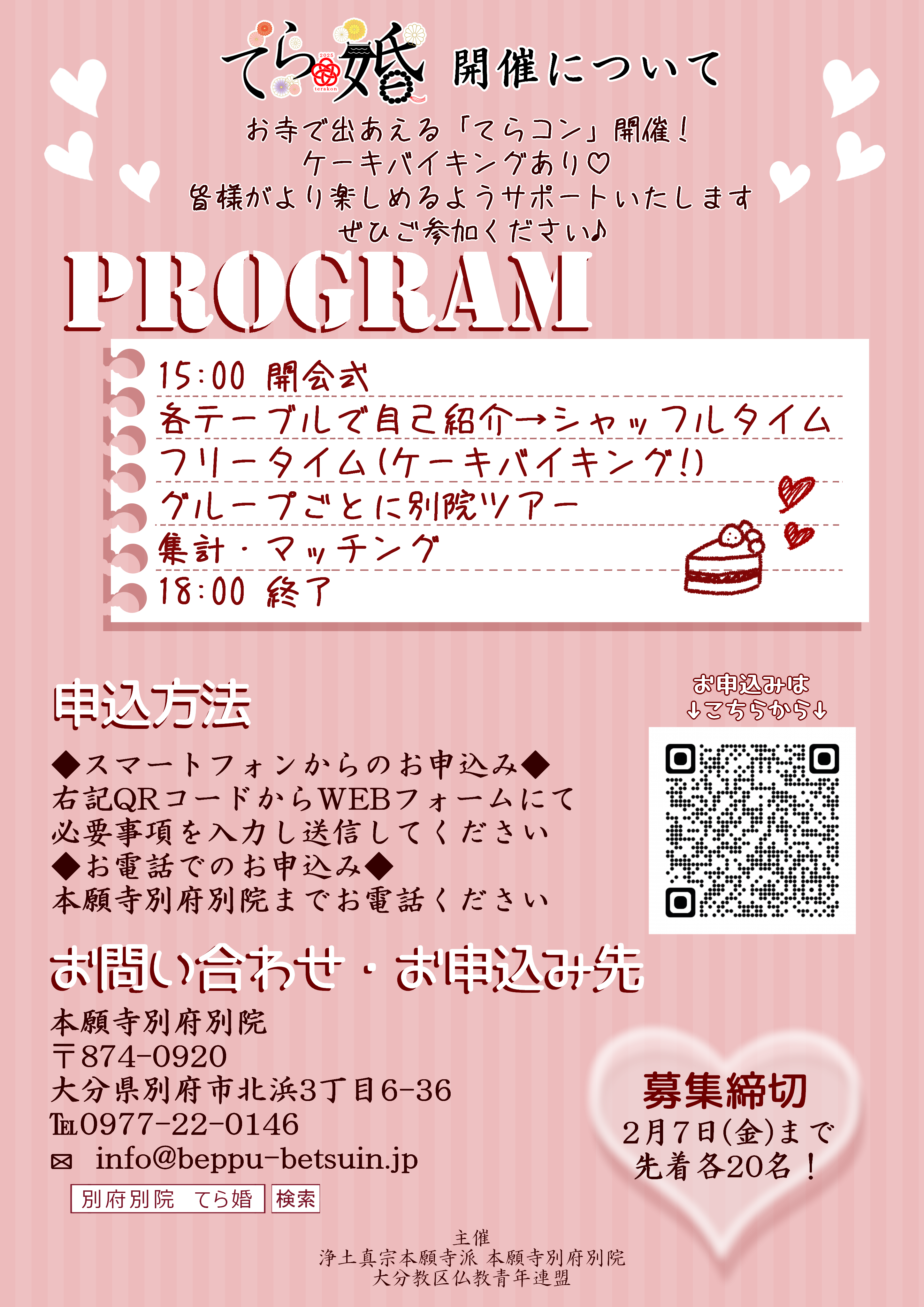 | 申 込 | https://forms.gle/zWym8qwccip5o2RCA 本願寺別府別院へのお電話でも受け付けます(TEL0977-22-0146) |