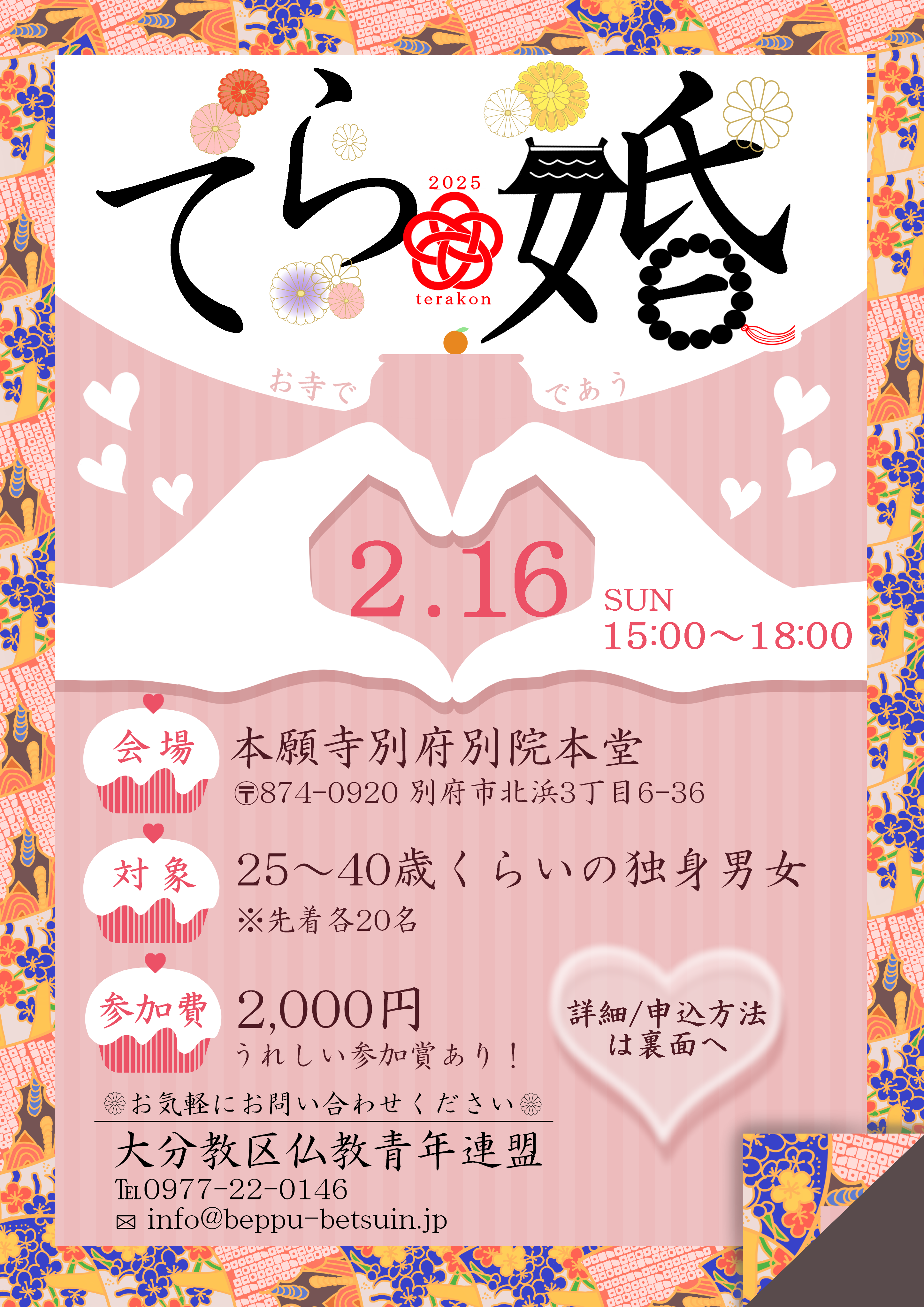 | 問い合わせ | 本願寺別府別院・大分教区仏教青年連盟 大分県別府市北浜3-6-36 TEL 0977-22-0146 mail info@beppu-betsuin.jp |