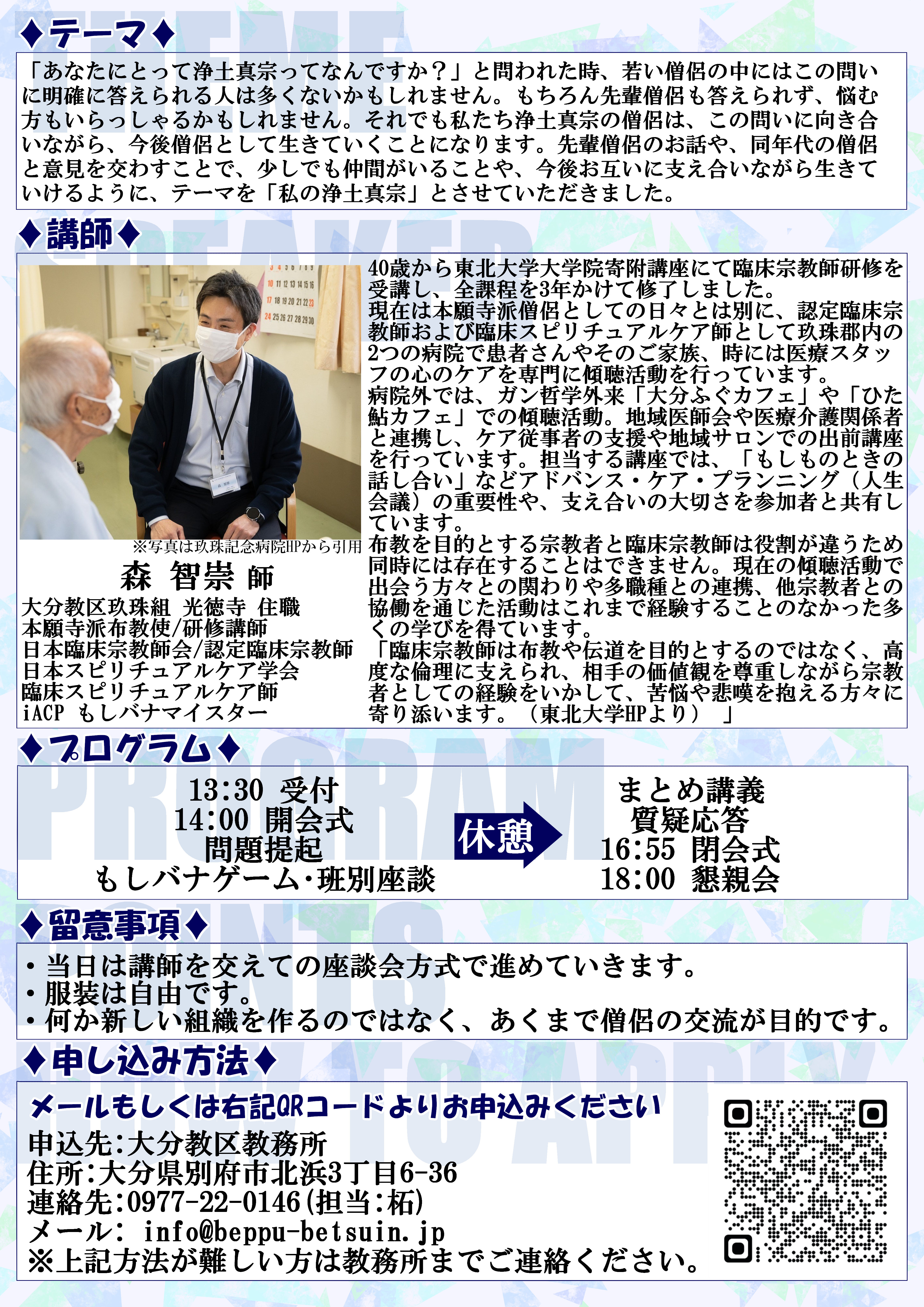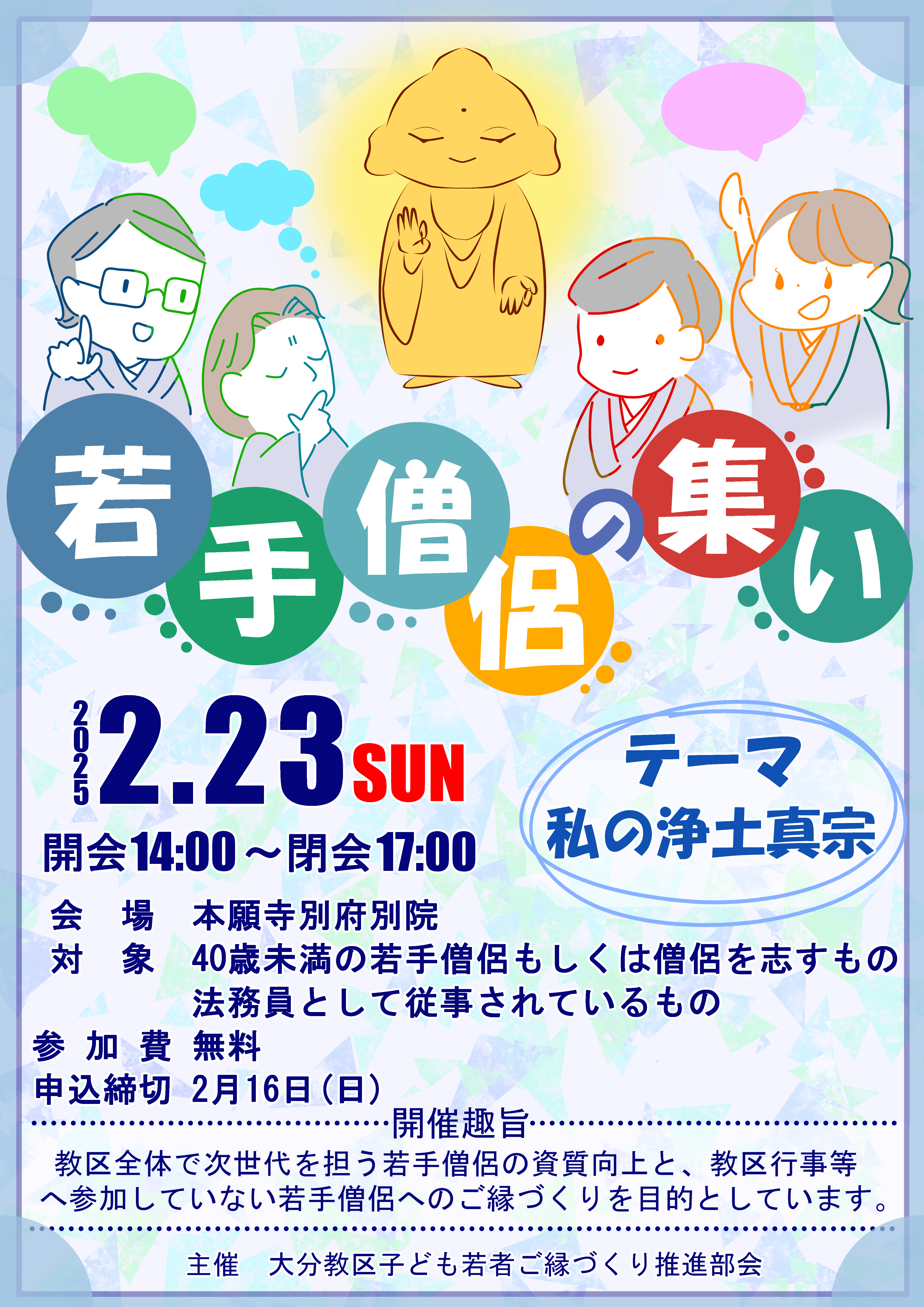 今般、大分教区の将来を担う若手僧侶の資質向上と教区行事等へ参加していない若手僧侶へのご縁づくりを目的とした「若手僧侶の集い」を開催します。是非ご参加ください。